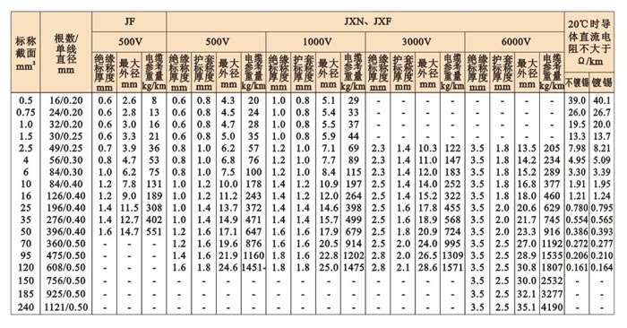 2、JF型电缆绝缘性能符合GB8815的规定,JXN、JXF型电缆绝缘性能符合GB7594.2的规定,绝缘标称厚度符合下表的规定,绝缘平均厚度不小于标称值,其最薄点厚度应不小于标称值的90%-0.1mm; 3、JXN、JXF型电缆护套性能应符合JB6213.1规定,护套的标称厚度符合下表,护套平均厚度应不小于标称值,其最薄点厚度应不小于标称值的85%-0.1mm; 4、成品电缆(电线)导电线芯直流电阻在20℃时,符合表中规定; 5、成品电缆(电线)的弯曲性能满足JB6213.1-92规定; 6、成品电缆(电线)的热效应性能满足JB6213.1-92规定; 7、成品电缆(电线)的耐溶剂性(二甲苯)满足JB6213.1-92规定; 8、成品电缆(电线)的耐浸渍漆性(双酚A环氧无溶剂浸渍漆)满足JB6213.1-92规定。 |