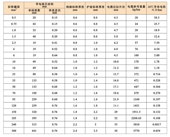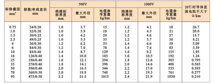 1、导体为镀锡铜线,性能符合GB3965-83标准规定,单线根数允许大于表中所列根数,单线标称直径按标称截面及相应根数确定;
