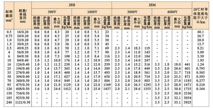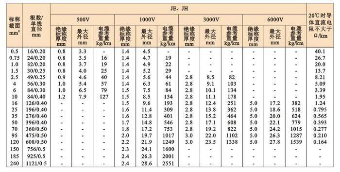 电机引接线JYJ JF JH JXF JEH JG导体采用镀锡铜丝,其结构符合以下表中的规定,性能符合JB947-76《橡皮和塑料绝缘电线电缆铜导电线芯》中的要求