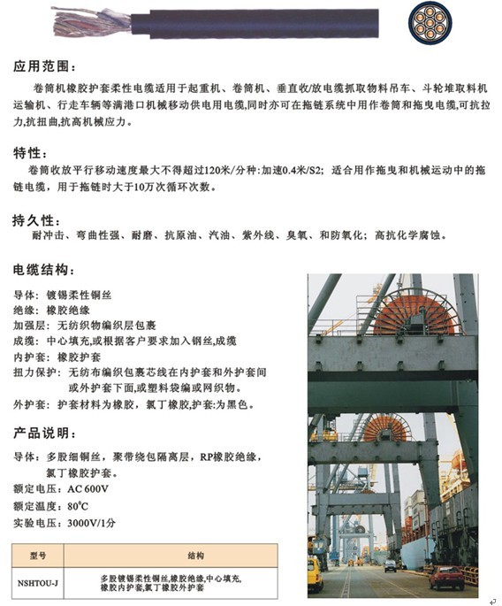 产品名称:NSHTOU-J橡胶外护套卷筒机柔性电缆,抗扭曲。