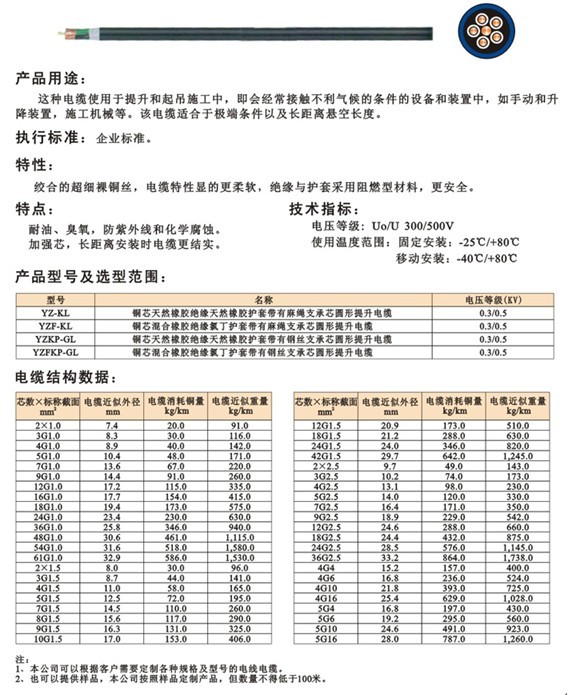 产品名称:YZ-KL YZF-KL YZKP-GL YZFKF-GL提升电缆——加强芯圆电缆。