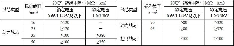 1)电缆20℃时的绝缘电阻,应符合表5的规定。