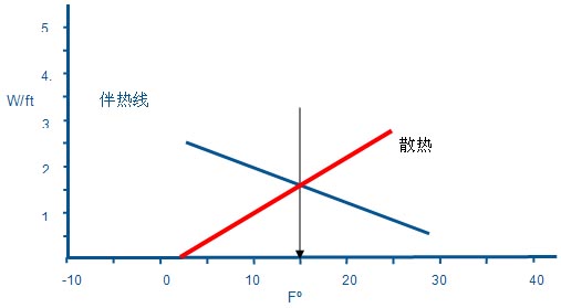 伴热系统的功能就是保证在恶劣气候下,管道处于安全温度,从水管的安全角度讲,一般我们把管道的维持温度设定在15摄氏度,而对于环境最低温度,要看管道所处位置具体气候条件来定,总体来讲,伴热系统的设计就是要使管线的散热与伴热电缆的发热达到一个平衡,而平衡点就是15摄氏度(如图1):